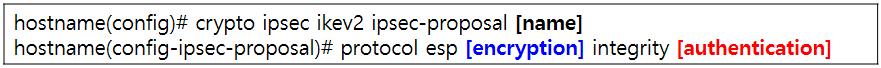 트래픽의 보호를 위한 암호화 방식을 설정할 수 있으며 IKEv1, IKEv2 각각의 명령어는 아래와 같다.