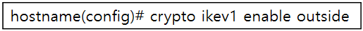VPN 터널이 맺어질 때 사용되는 Interface(보통 outside interface) 에서 IKE 활성화하는 작업이 필요하며, 명령어는 아래와 같다.