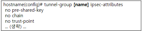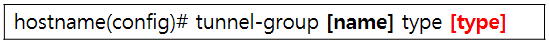 4-1. 터널 그룹을 생성하는 커맨드는 아래와 같으며 type 지정 시, 원격 액세스 터널의 경우 'ipsec-ra', L2L의 경우 'ipsec-l2l'로 설정하면 된다.